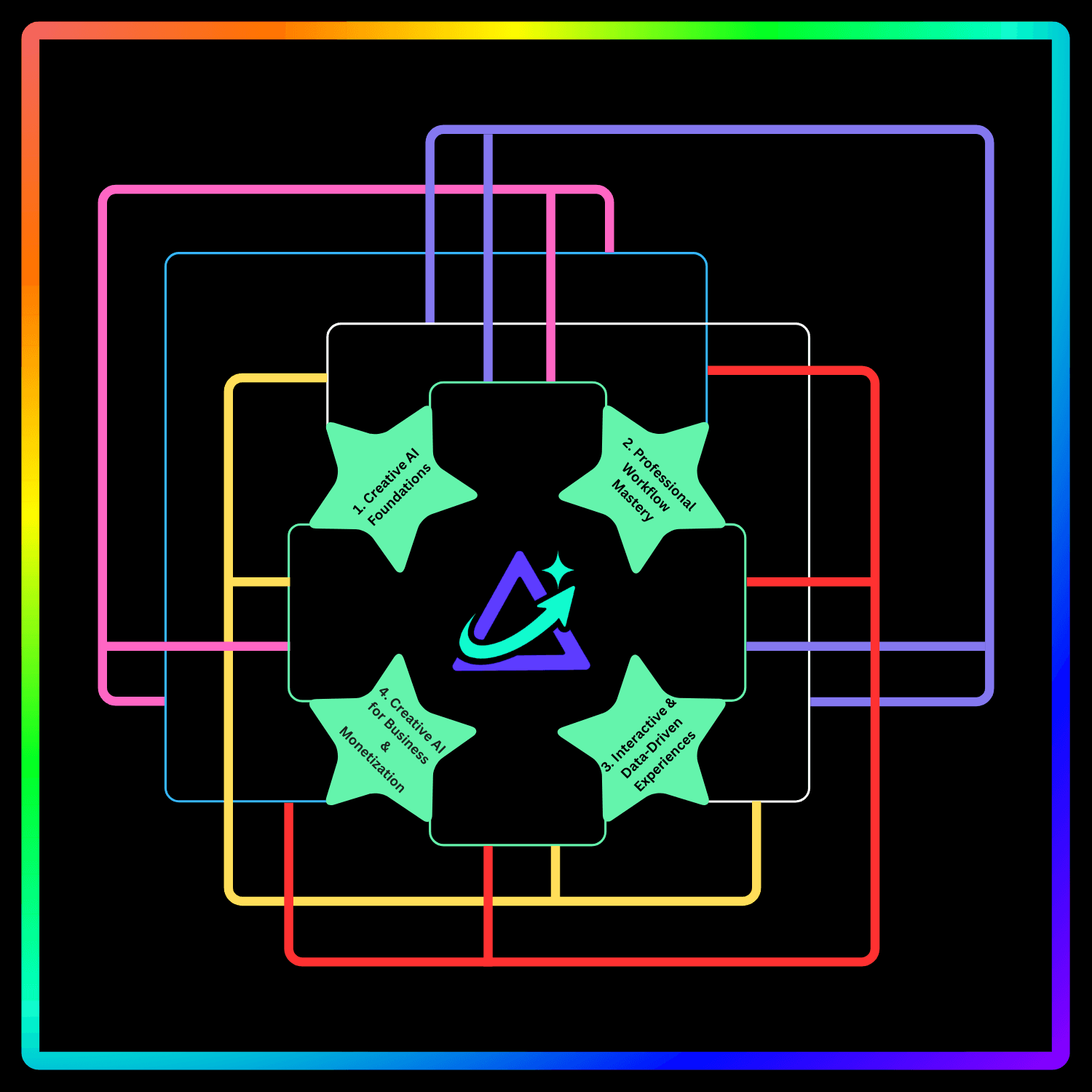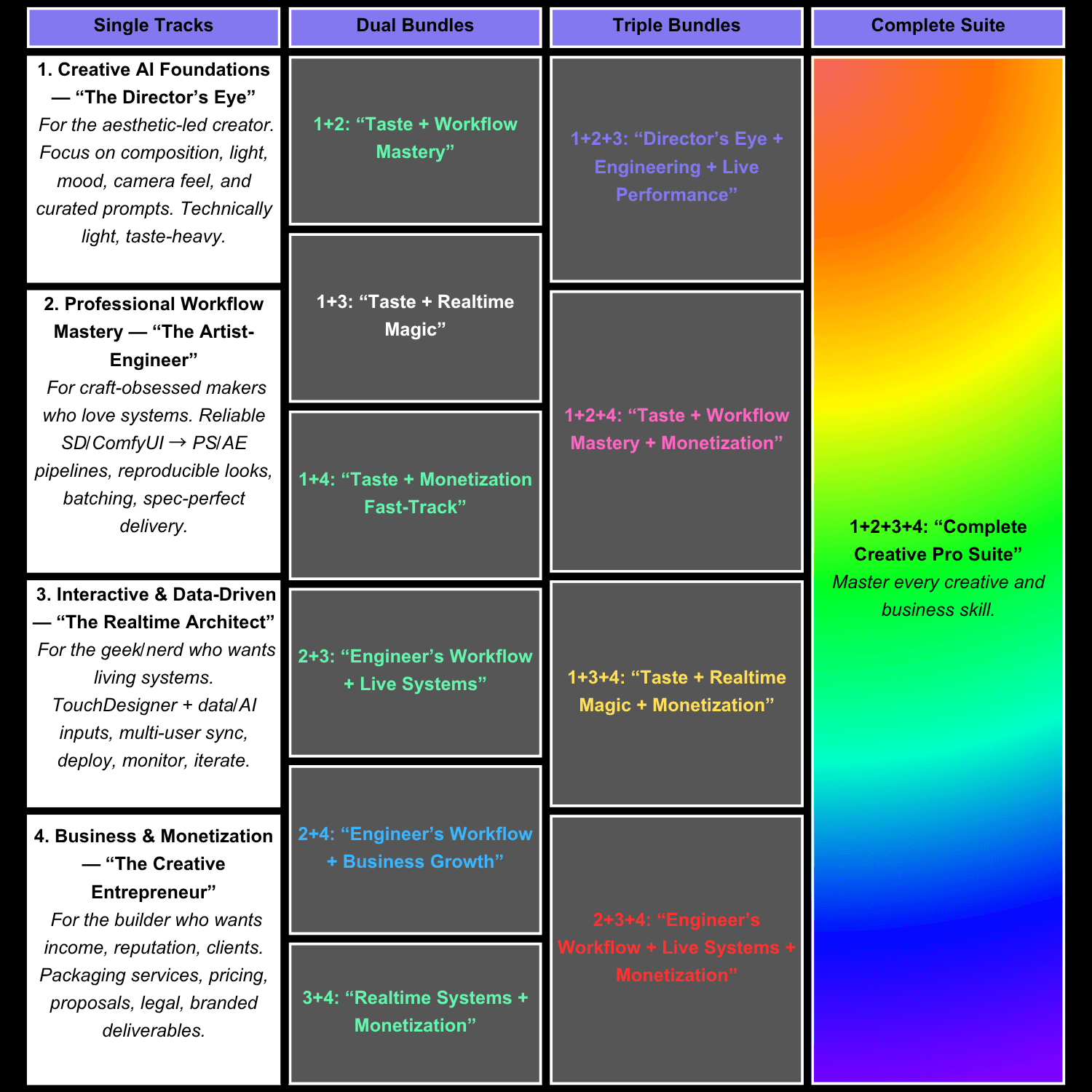 We offer four learning paths you can take individually or as a bundle: 1. Creative AI Foundations — Prompting, storyboards, visual aesthetics. 2. Workflow Mastery — SDXL/ComfyUI pipelines, delivery specs, LUTs. 3. Interactive & Data-Driven — TouchDesigner, sensors/APIs, realtime visuals. 4. Business & Monetization — Proposals, pricing, handover packages. Each path includes lessons + toolkits and is designed to turn skills into finished projects.